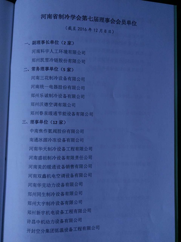 2016年12月10日河南省制冷學會第七次會員代表大會在鄭州順召開,中南焦作氨閥股份有限公司參加本次大會,并當選河南省制冷學會理事單位。