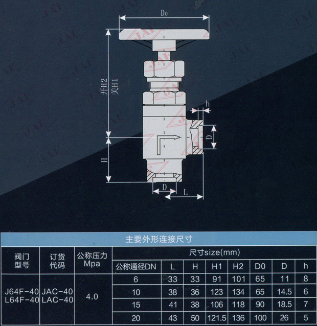 J表示截止閥 L表示節(jié)流閥 A表示結(jié)構(gòu)形式為直角式 C表示插焊連接 40代表公稱壓力為4.0MPa 40后不標(biāo)注代表代表閥體材質(zhì)為鍛鋼。