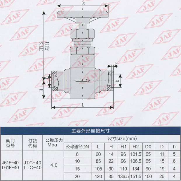 適用范圍 適用于公稱壓力為4.0MPa、公稱通徑為DN6-DN20進(jìn)出口插焊連接、閥體材料為鋼質(zhì)的直通截止閥和節(jié)流閥?! ¢y門屬性 公稱壓力為4.0MPa,試驗壓力為6.0MPa,適用溫度為-50°C-+200°C適用介質(zhì)為氨、氟等。 J表示截止閥 L表示節(jié)流閥 T表示結(jié)構(gòu)形式為直通式 C表示插焊連接 40代表公稱壓力為4.0MPa 40后不標(biāo)注代表閥體材質(zhì)為鍛鋼。